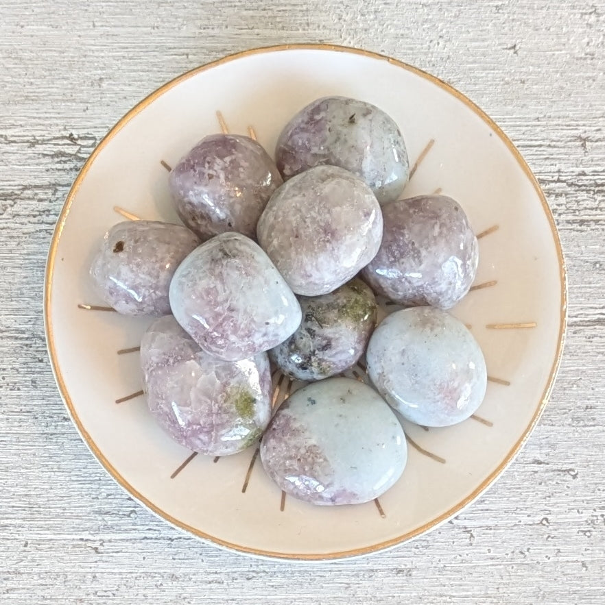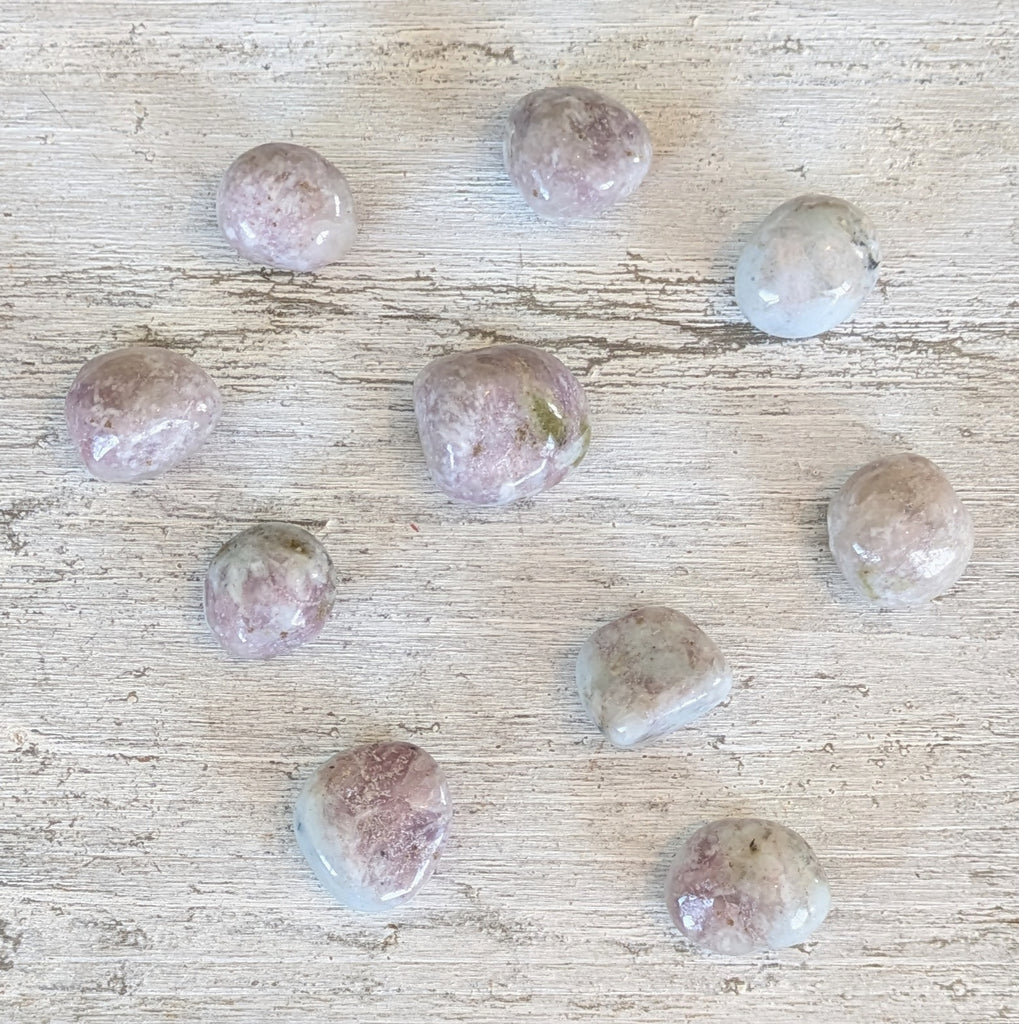 You will receive one tumblestone measuring approx. 15-25mm. Our current stock has high amounts of Lepidolite inclusions as pictured.