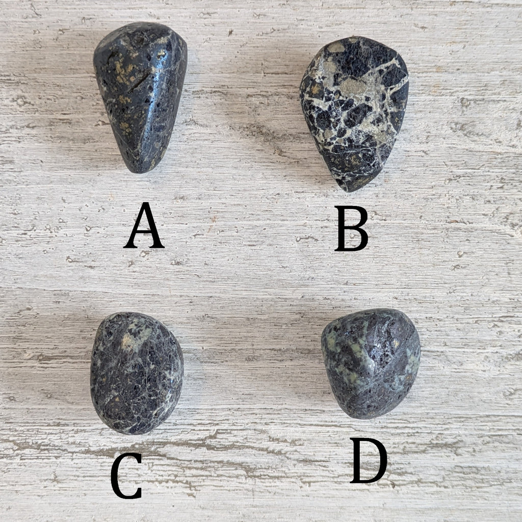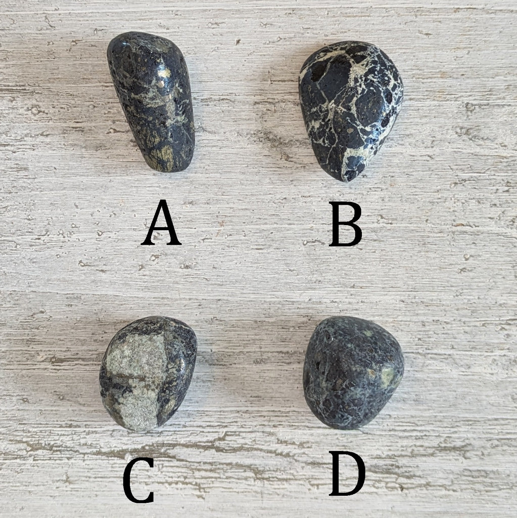 These tumblestones are sold as seen, A and B measure approx. 35-45mm, and C and D measure approx. 25-35mm. Our current stock is not highly polished and has a matt like feel.