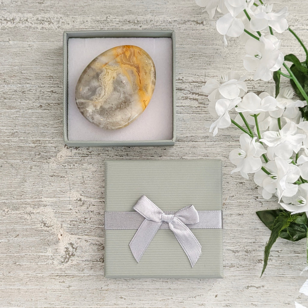 This listing is for one sold as seen, beautiful Crazy Lace Agate Thumb Stone presented in a gift box.