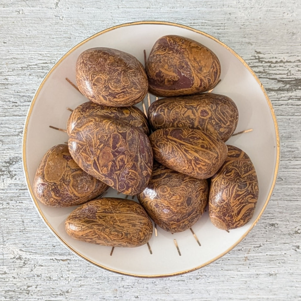 Mariam (Miriam) Jasper, also known as Calligraphy Stone amongst many other names, is a wonderful unique mineral composed of compressed fossilized shells, bones, and vegetation from an ancient swamp in the Himalayan Mountains area. They were formed due to the extreme pressure exerted in this area during the mountain range formation. A unique and complex stone.
