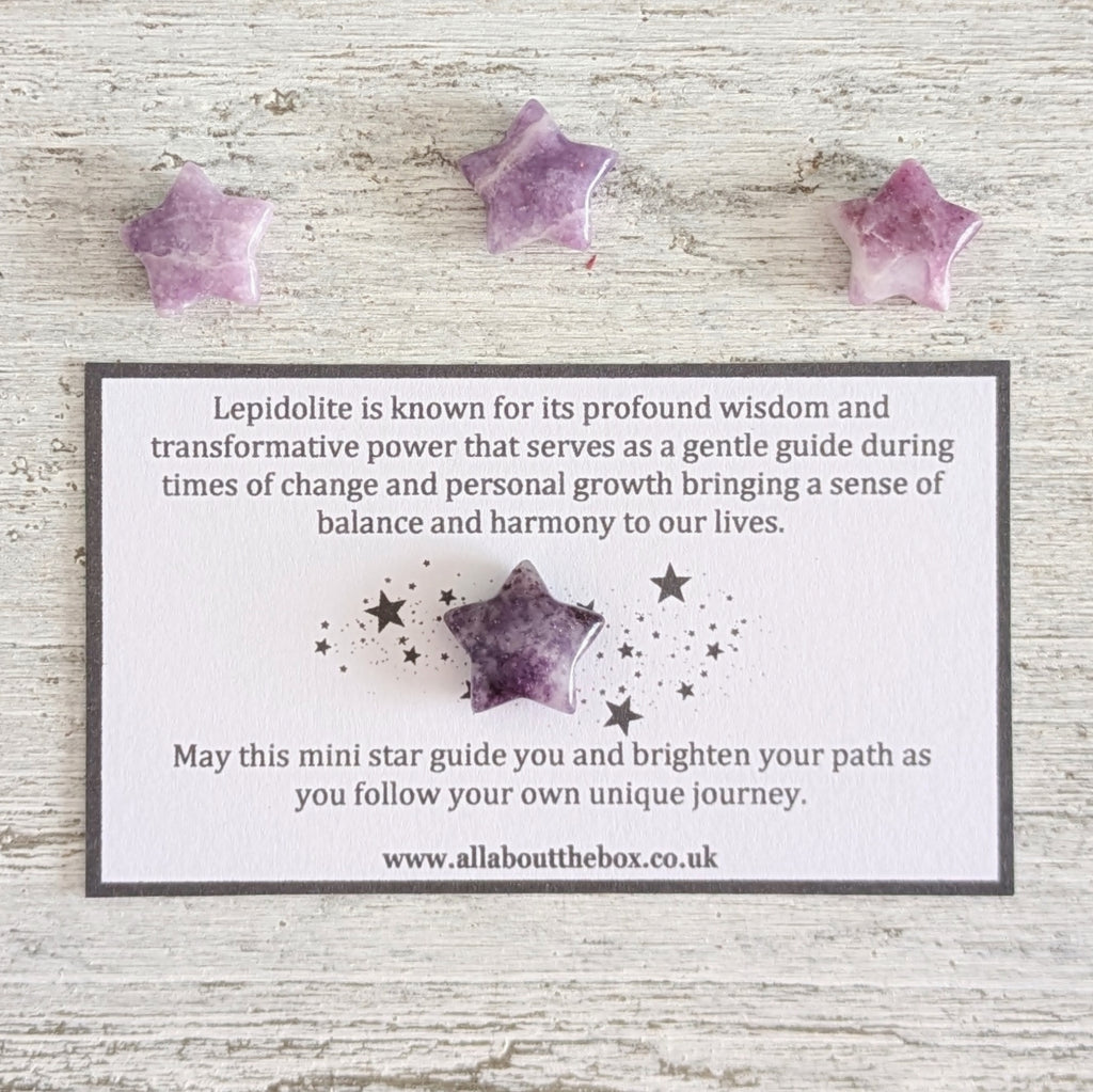 Card reads "Lepidolite is known for its profound wisdom and transformative power that serves as a gentle guide during times of change and personal growth bringing a sense of balance and harmony to our lives. May this mini star guide you and brighten your path as you follow your own unique journey."