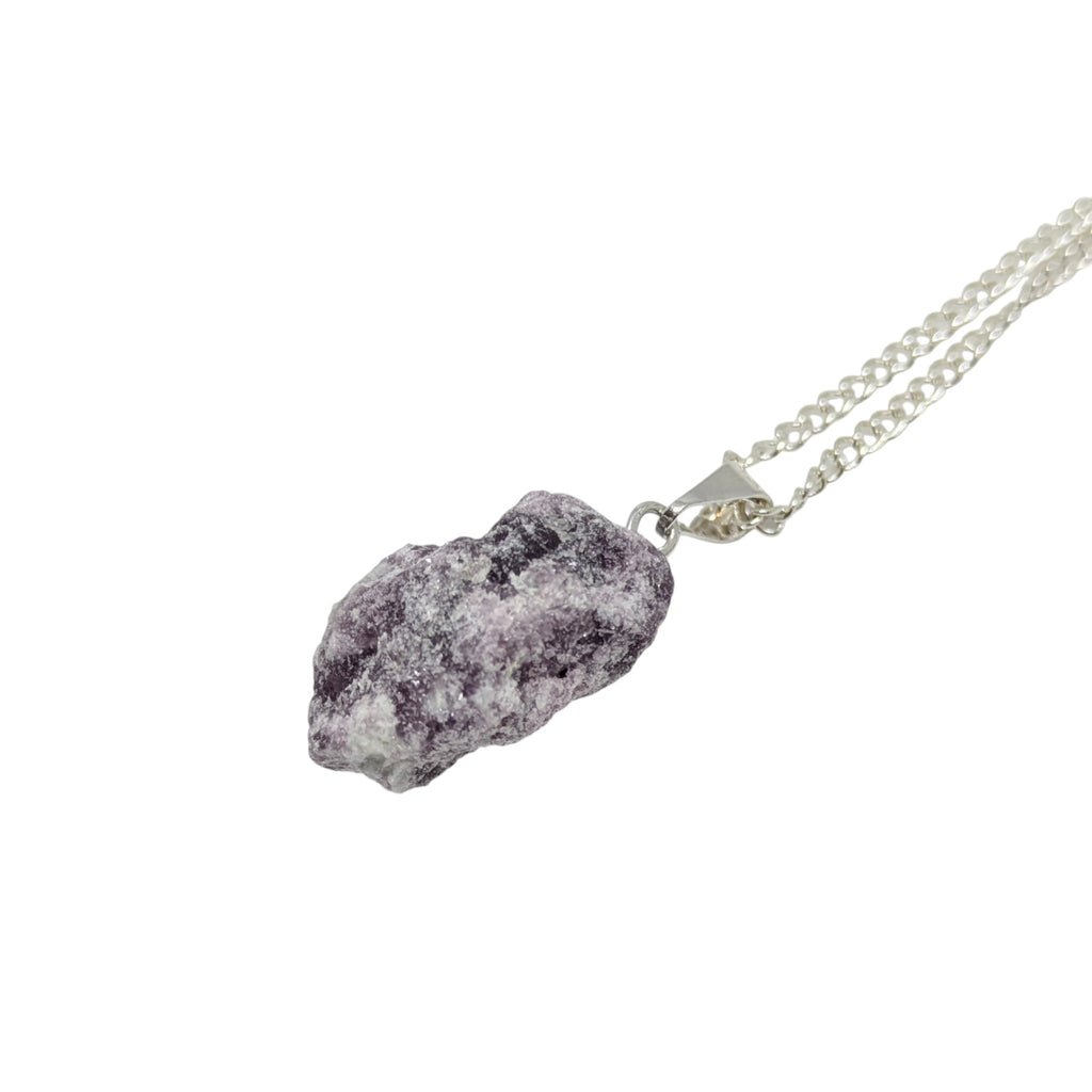 A beautiful sold as seen pendant necklace made from a piece of raw, natural Lepidolite that has an otherworldly aura, and is presented in a lovely little gift box, which includes a card outlining the properties of the crystal.