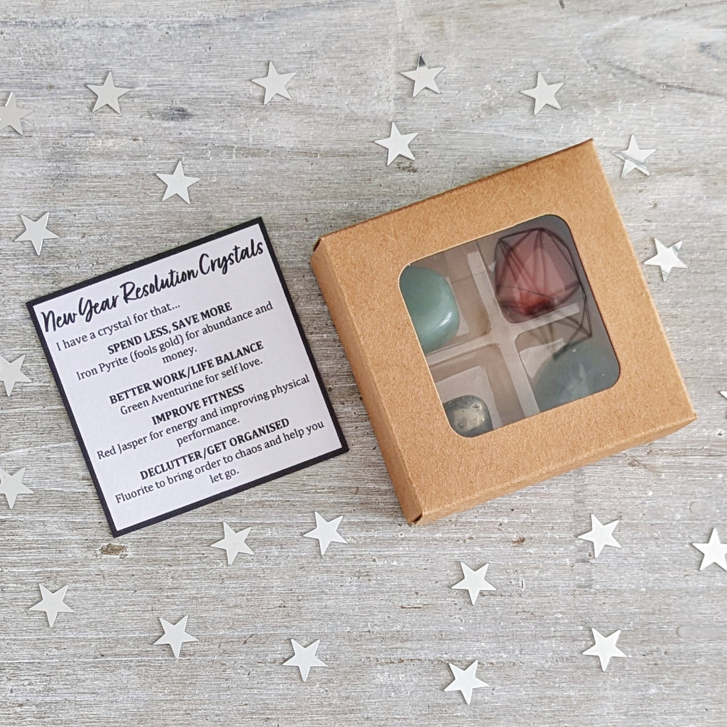 A collection of four crystal tumblestones to help with your New Year Resolutions presented in a small selection box.