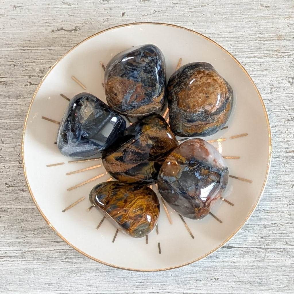 Pietersite is a beautiful and rare crystal, also known as the "Tempest Stone" and is a commercial term for a variety of the mineral chalcedony and is a member of the Quartz family. Originating from Namibia and China, polished Pietersite ranges in colour from brownish-red, to blue-grey, and chatoyant yellow. It is a major meditation stone used extensively to calm, de-stress, and soothe. As the Tempest Stone, it began its journey being folded and stressed within the earth, yet emerged as something truly beautiful. Because of its tumultuous origins it brings the power to overcome tension and hardship and replacing them with motivation and happiness.