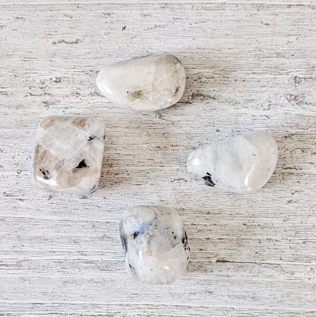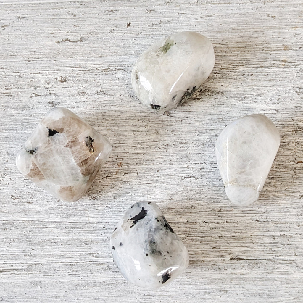 Rainbow Moonstone, is also known as White Labradorite, and isn't actually a moonstone but a feldspar mineral and therefore a variety of labradorite. Rainbow moonstone is known for its iridescent flashes of colour and ethereal glow. It is a soothing yet captivating stone that promotes balance and harmony whilst also bringing inspiration.