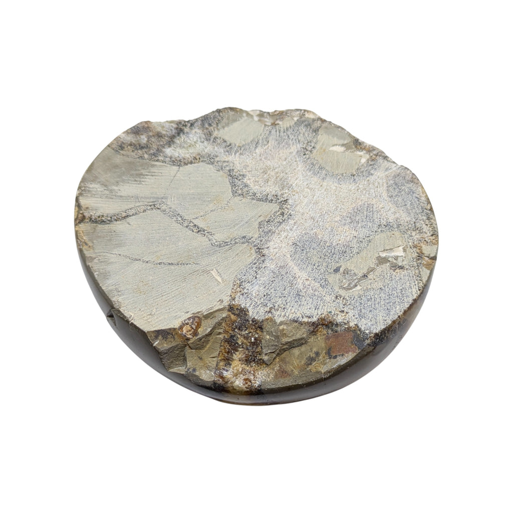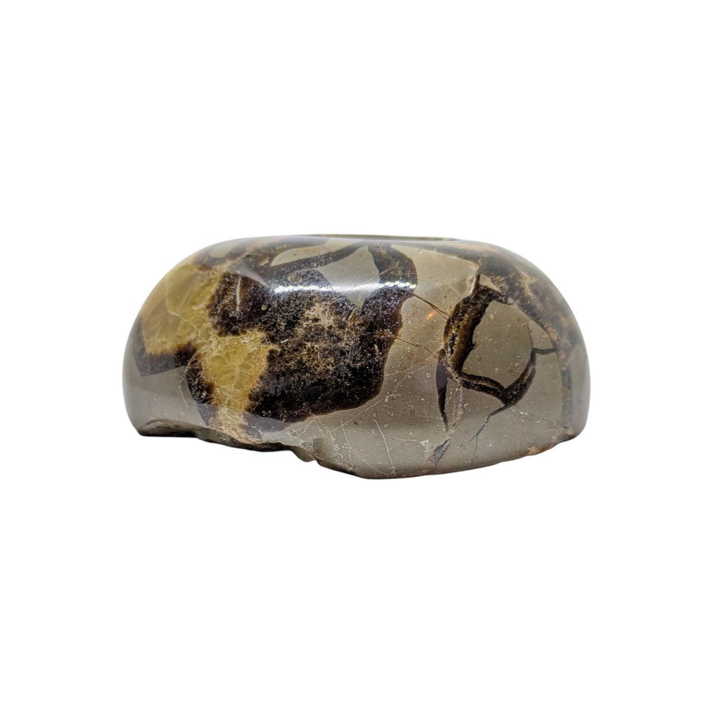 Septarian is a very protective stone that also has the healing energy to nurture and ground to encourage feelings of happiness and understanding. Septarian, also referred to as Dragon Stone, is a tri colour stone that is a combination Aragonite (the brown), Calcite, (the yellow), and Limestone (the grey). Because of the make up of this stone the surface tends to have more pitting and inclusions. It is referred to as Dragon Stone as its appearance and patterns resemble dragon scales, and it is this appearance that makes this one of a kind tealight holder a captivating and unique work of art.